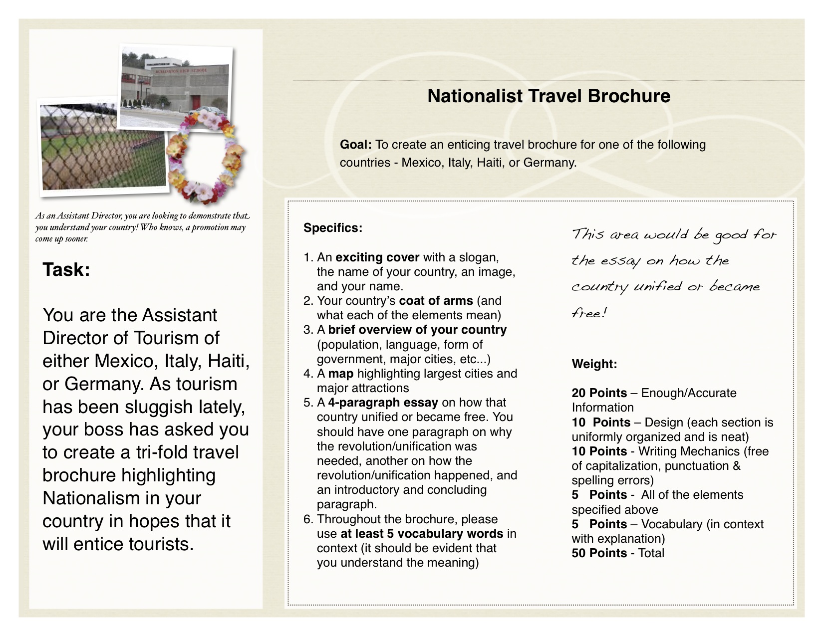 This was one of my favorite activities to design – to demonstrate their understanding of nationalism, my students created a tri-fold travel brochure for Italy, Germany, Haiti, or Mexico (we had just discussed how these nations became free/unified). For the assignment, students were working for a Department of Tourism in one of the above nations and needed to ramp up tourism for the nation. To accomplish this, they had to create a travel brochure that highlighted the nations origins as well as provide information about the country today.