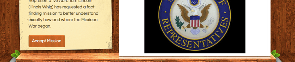 This last example was an assignment for a graduate class called Digital Literacies and Emerging Technologies. The assignment was to create an interactive webquest. Around this time, I was researching about the Mexican War and Abraham Lincoln’s quest to get to the bottom of exactly how it happened. I had read that Lincoln (who was in the House of Representatives) was called “Spotty Lincoln” as he wanted to know the exact spot over which the war began (he was doubtful of the government’s story that the Mexicans had invaded the US). This fascinated me and I envisioned my students as staffers attempting to answer the questions that Lincoln had.