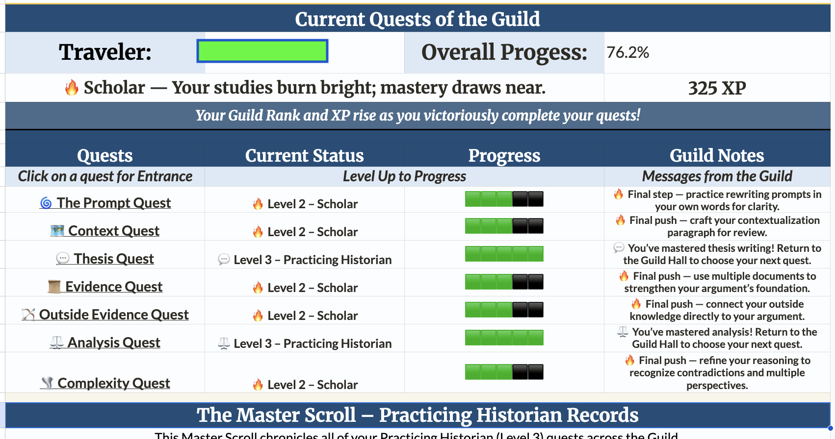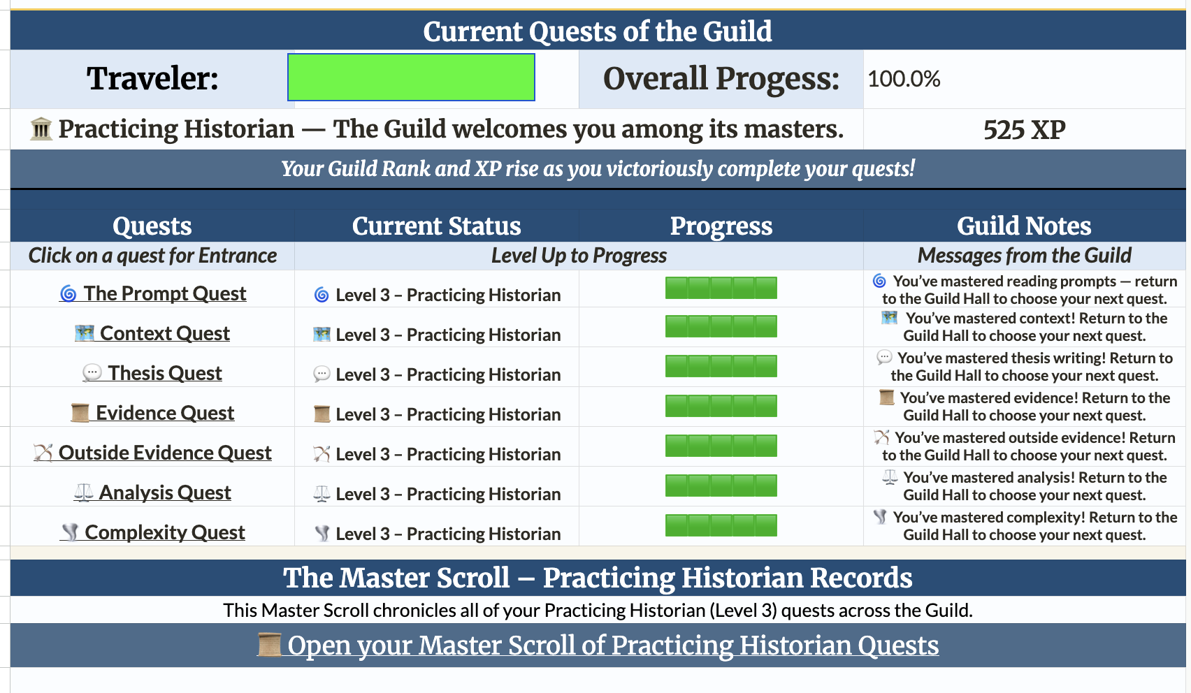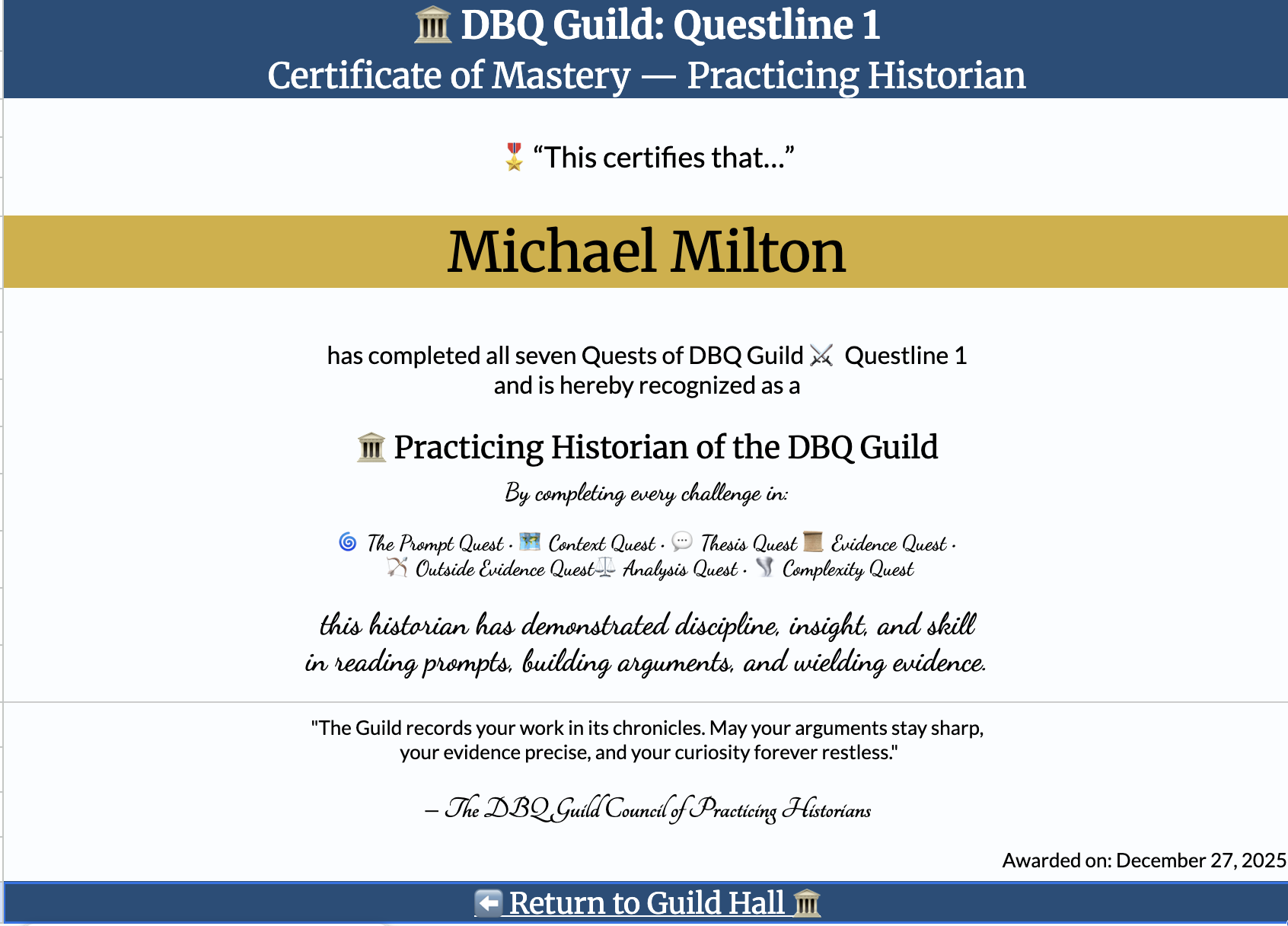 I really enjoyed making the DBQ Guild. Thinking about these skills in isolation helped sharpen my own understanding of the DBQ, and the creative process itself was genuinely fun. Also tiring. So many roadblocks along the way! But in the end, I am very proud of what I put together.