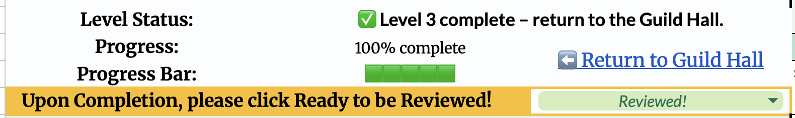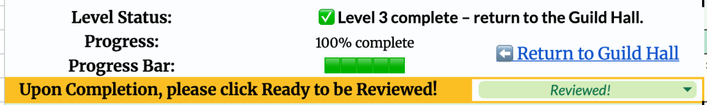 As students worked, I worked. When they completed a level, they marked it as “Ready to be Reviewed,” which the tracker flagged at regular intervals or with a manual refresh. I could immediately see who needed feedback, leave targeted comments, and either approve the work or ask for revisions before moving on to the next student.