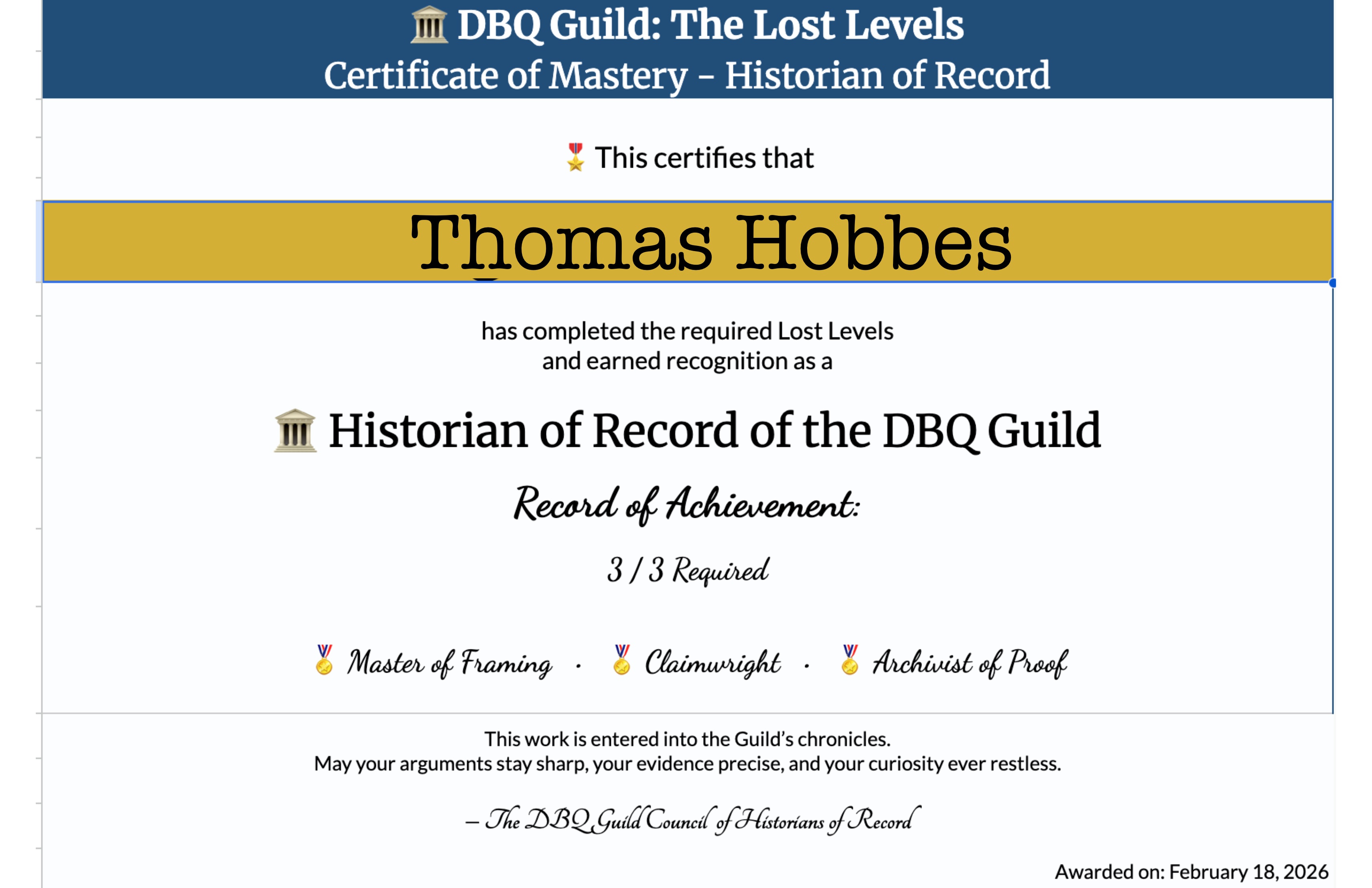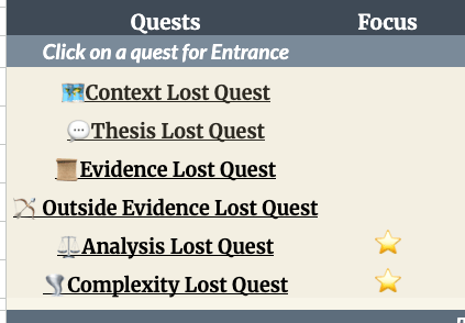 Because students move through different skill paths, I wanted their success to reflect that. When students successfully completed a skill set, they get awarded a fancy new title. Demonstrate proficiency in thesis, and you become a Claimwright. Claimwright might be my favorite. One of the best nights working on this project was coming up with the titles – Master of Framing (context), Archivist of Proof (evidence), Scholar of the Wider Record (outside evidence)!