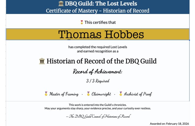 This fall, I built DBQ Guild: Questline I for my AP Modern World students around a simple premise: break the DBQ into discrete, teachable skills and allow students to practice each one intentionally. It was an exciting project. And it worked with my students. Students received targeted feedback while working, revised in real time and resubmitted within the same class period. Watching the system function the way I imagined (with a few hiccups, of course) was one of those rare “oh wow, this is working!” moments.