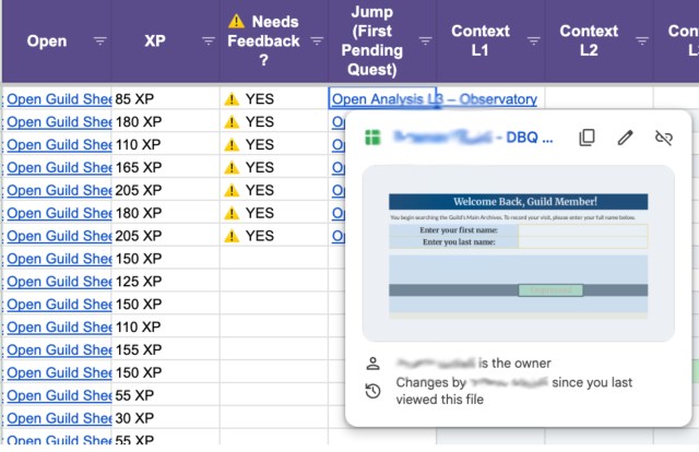Similar to Questline I, I assign the Lost Levels Google Sheet through Google Classroom, making a copy for each student and connecting it to my central tracker. Once connected, the tracker becomes the command center of the system. I can monitor student progress, jump directly into student pages when they request approval, and designate which skills each student should prioritize.